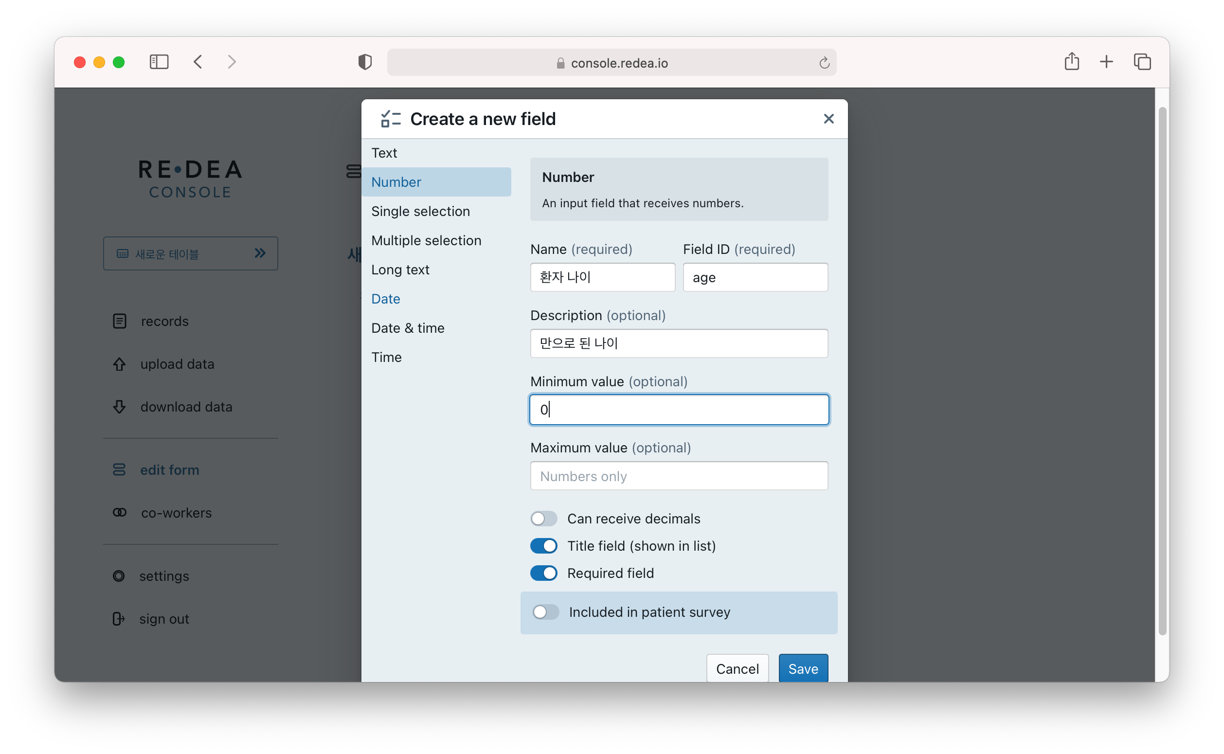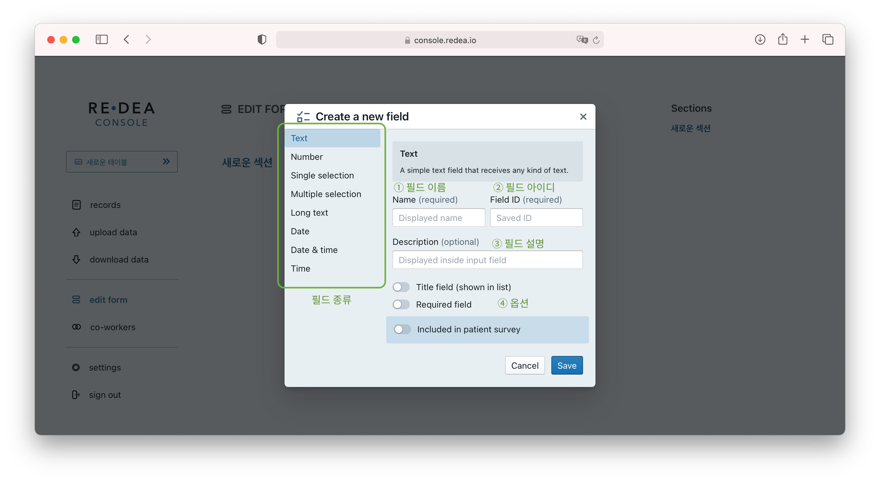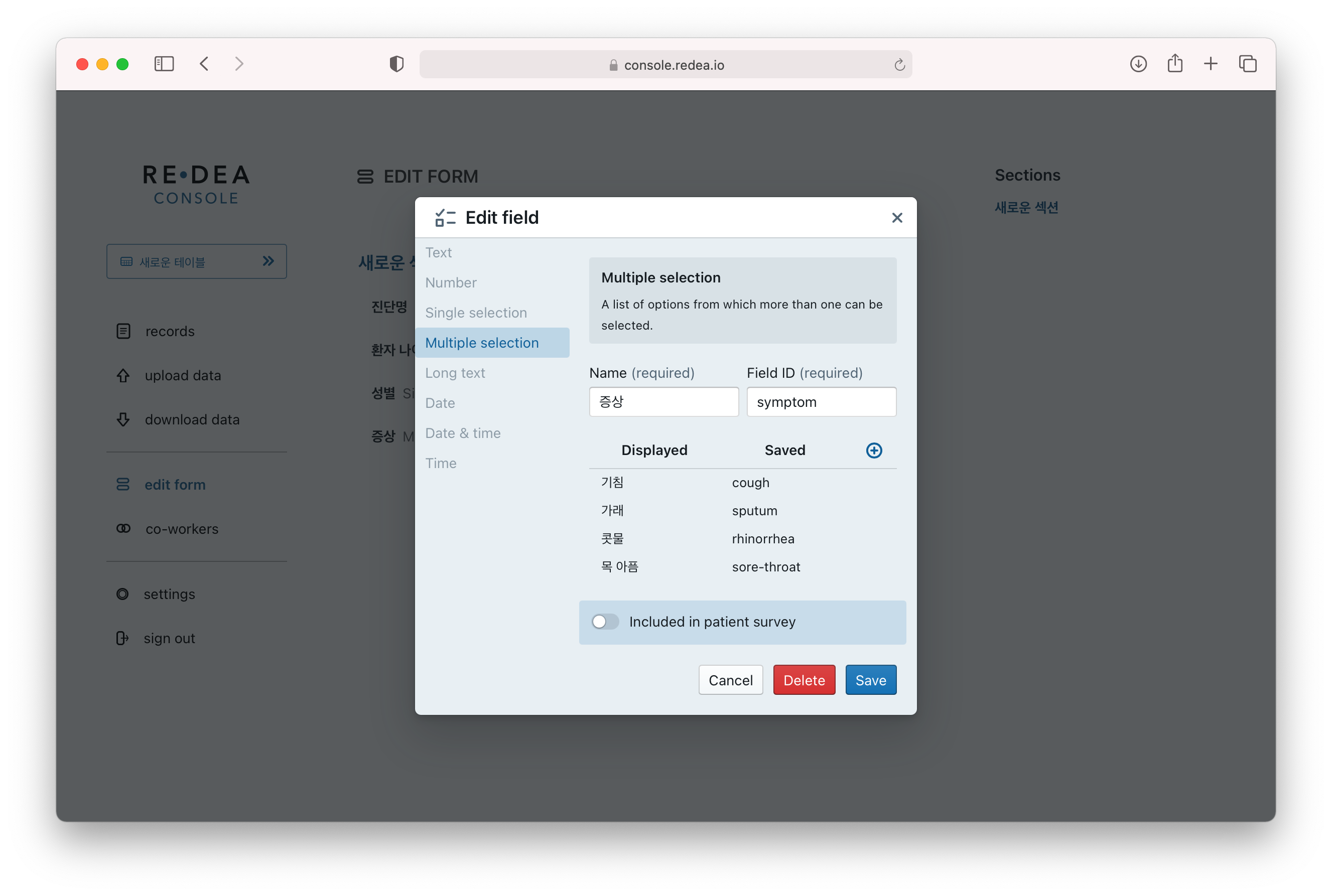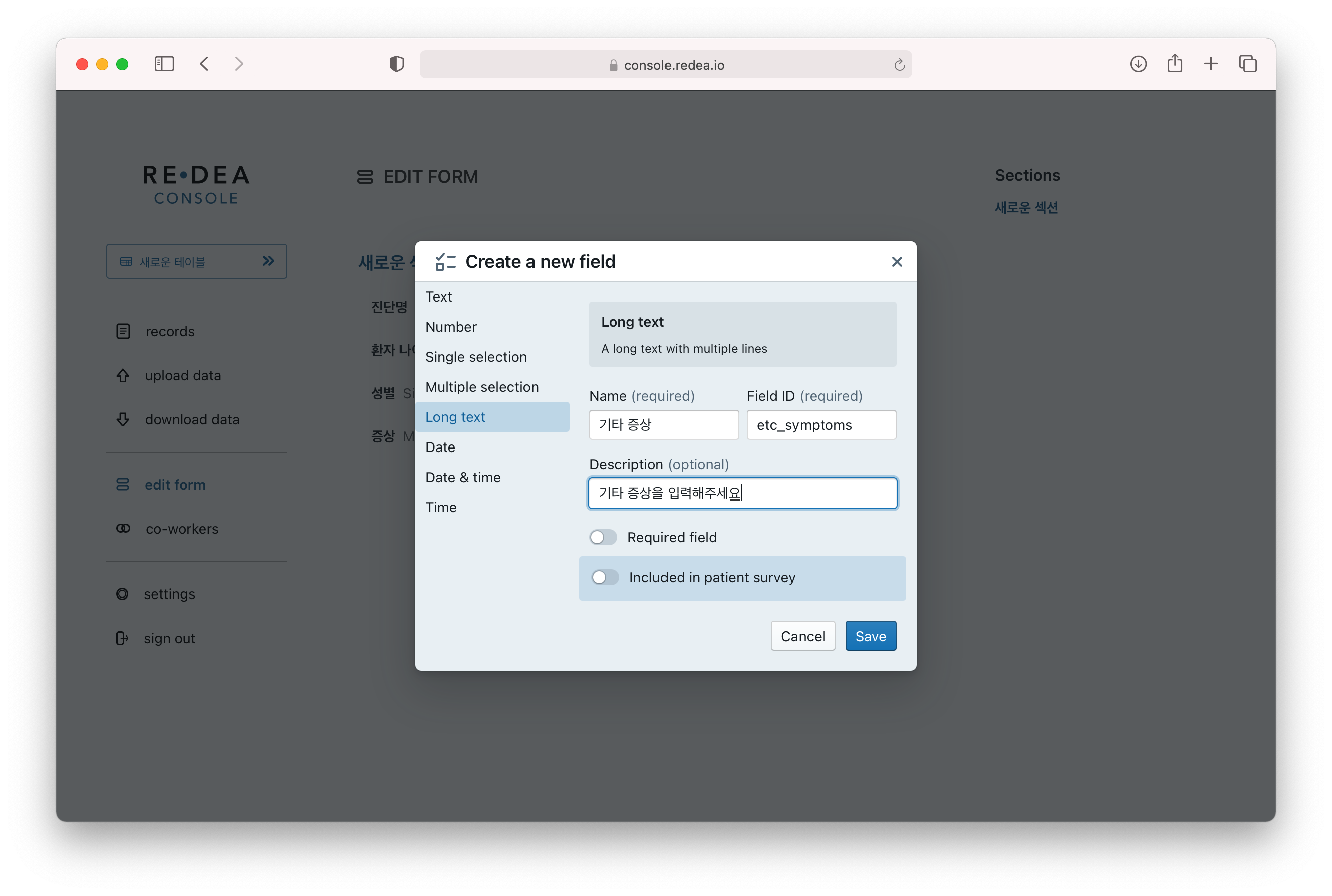 - Included in patient survey : 환자 설문용으로 설정하여서, 환자용 앱(REDEA Survey)에서 환자가 직접 입력할 수 있도록 합니다. 선택하면, 아래 description 항목이 추가로 표시되며, 여기에서 설문시 환자에게 제공될 안내문을 작성할 수 있습니다.