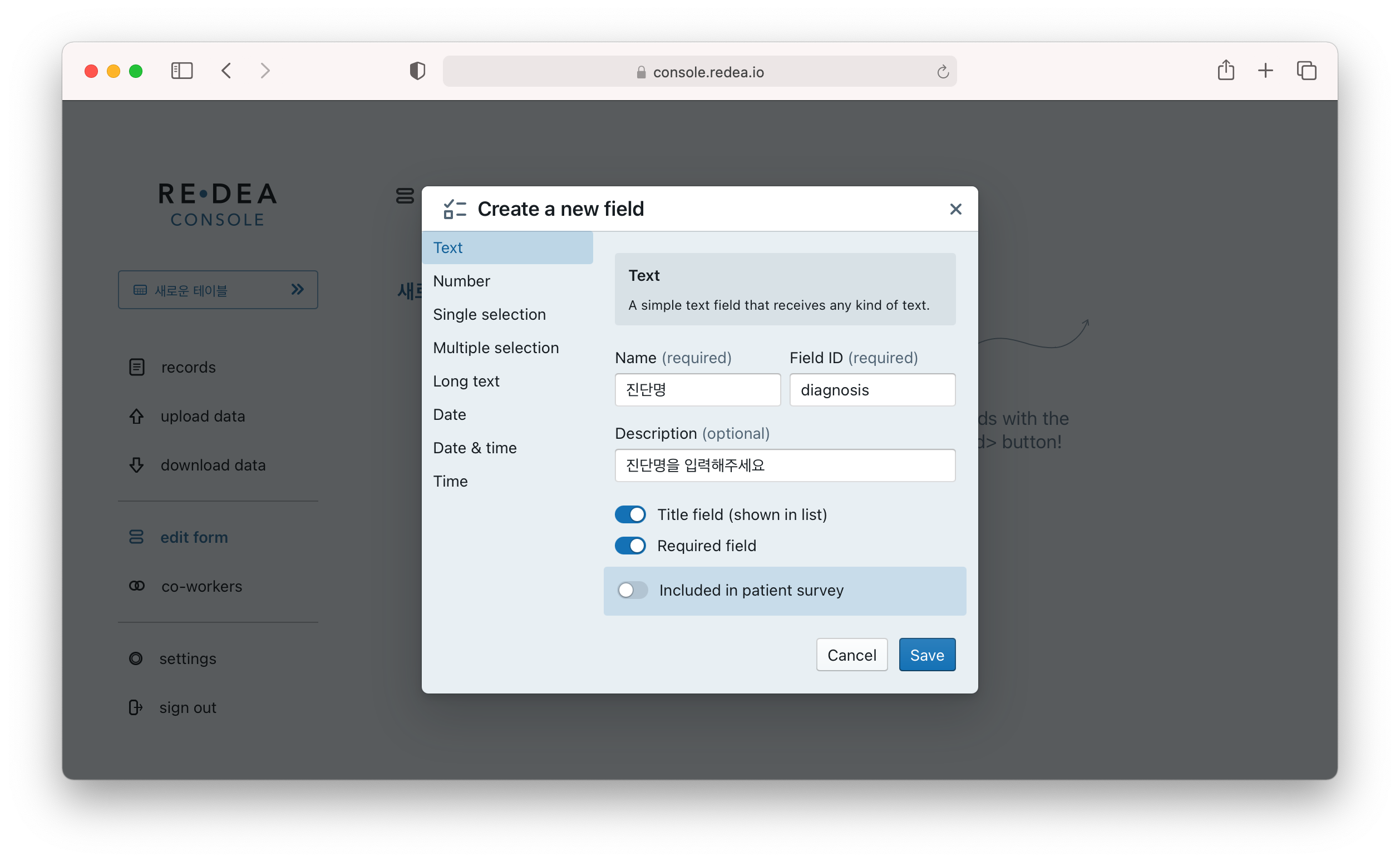 이 필드는 title field로 설정해서 나중에 한눈에 리스트에서 이 레코드의 진단명이 알 수 있도록 했으며, required field로 설정하여서 이 항목이 빠지면 나중에 빠뜨리지 않도록 하였습니다.
