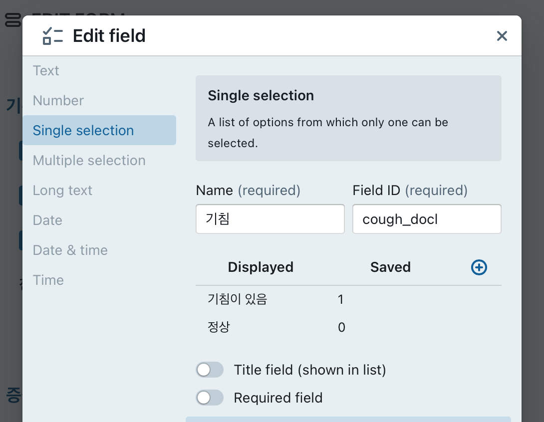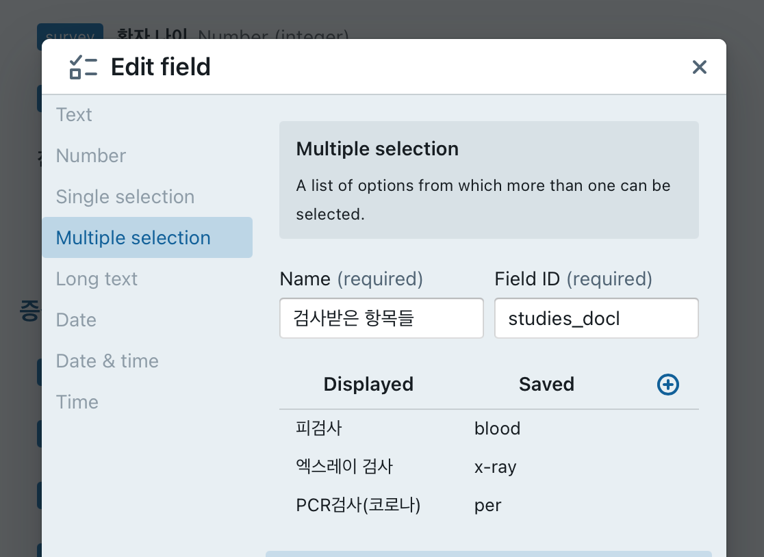 Single selection / multiple selection 인 경우에 활성화 되는 항목으로, 해당 항목의 표시되는 글자 (displayed) 와 이 항목을 선택했을때 저장되는 값 (saved)로 구분됩니다. 실질적으로 multiple selection의 경우에는 saved값을 포함한 column이름에 (필드ID-Saved글자), 선택하는 경우 숫자 1이 저장됩니다.필드 종류