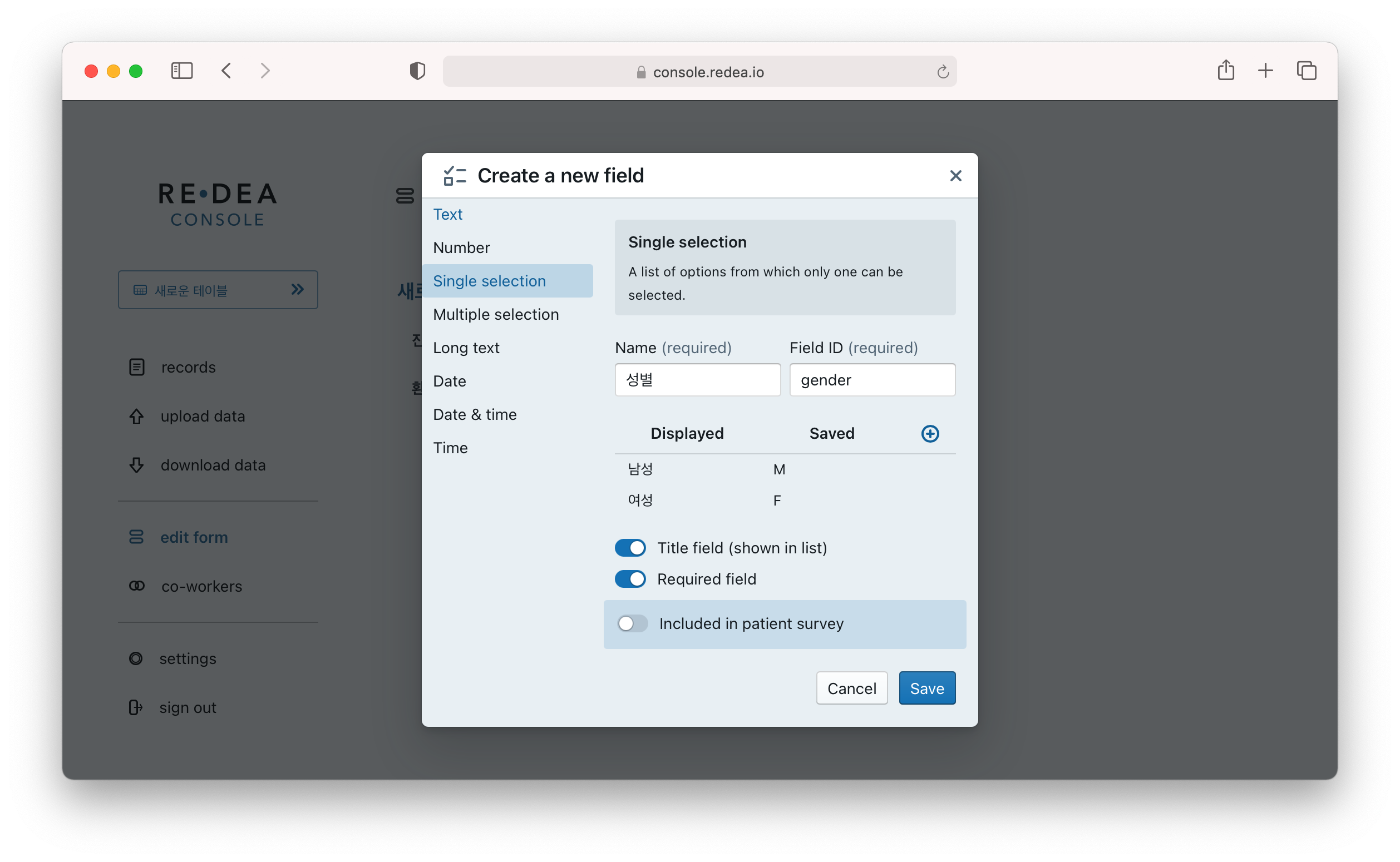 이번에는 남성 혹은 여성 둘 중 하나만 입력할 수 있는 single selection 필드를 만들어 보겠습니다.