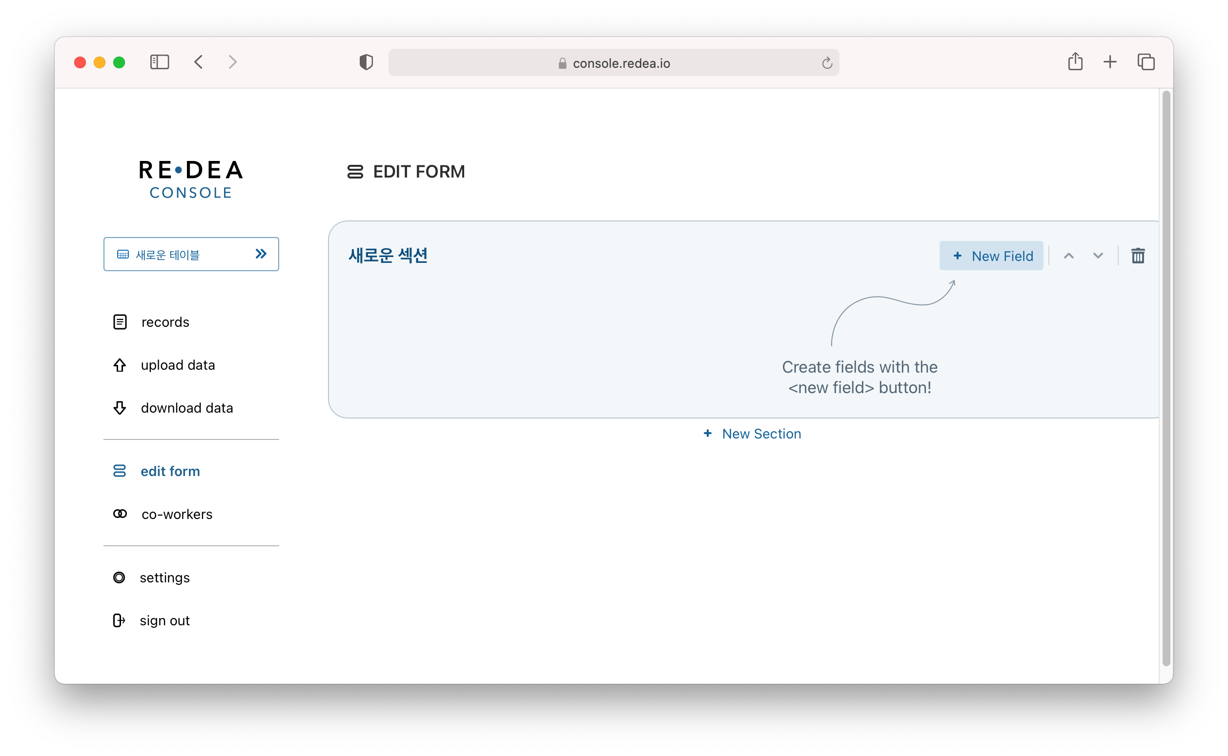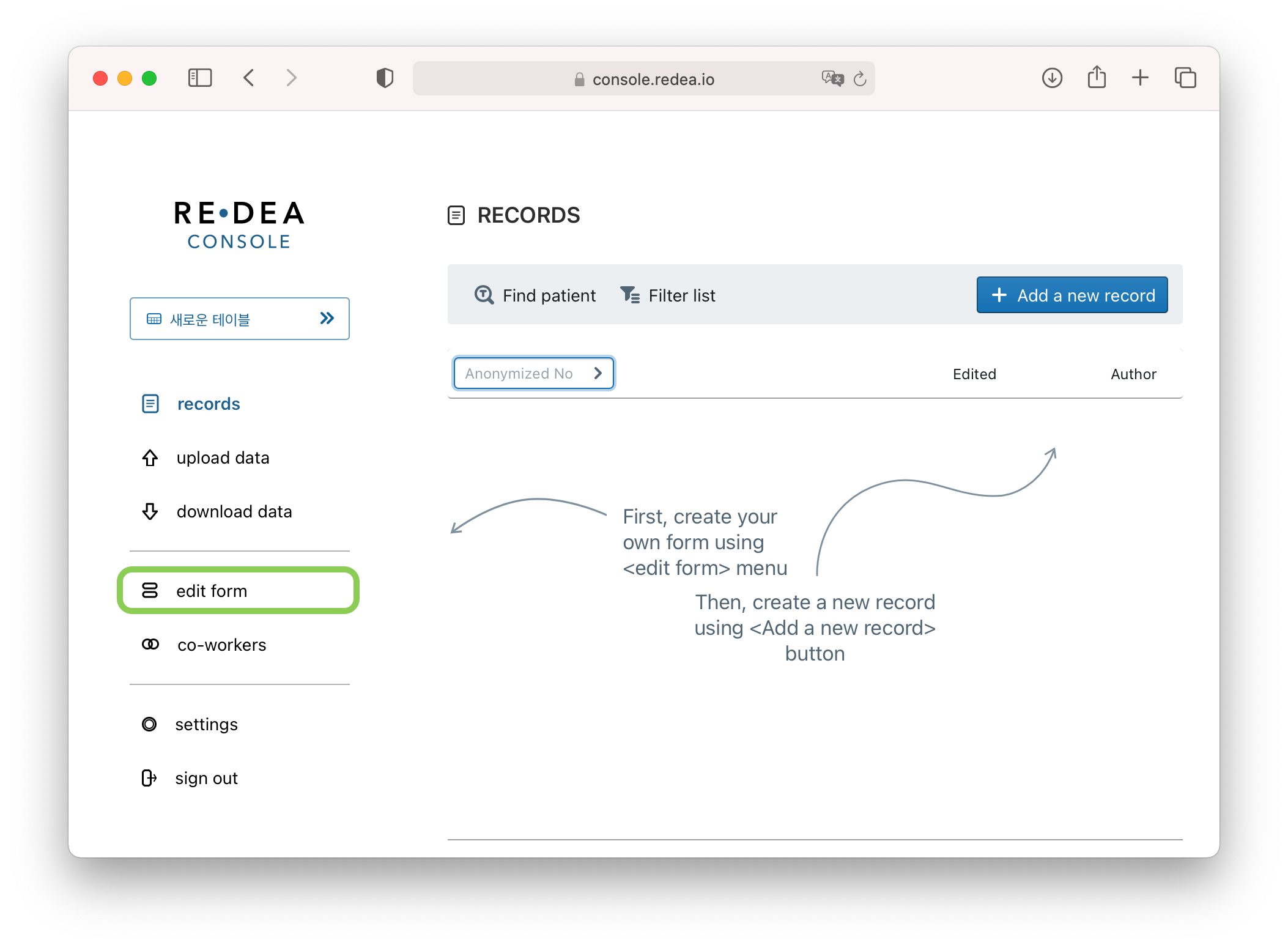 가장 먼저 해야할 일은 입력 폼 만들기 입니다.아래 화면에서 왼쪽 메뉴의 edit form버튼을 눌러 입력 폼을 만들고 수정할 수 있습니다.