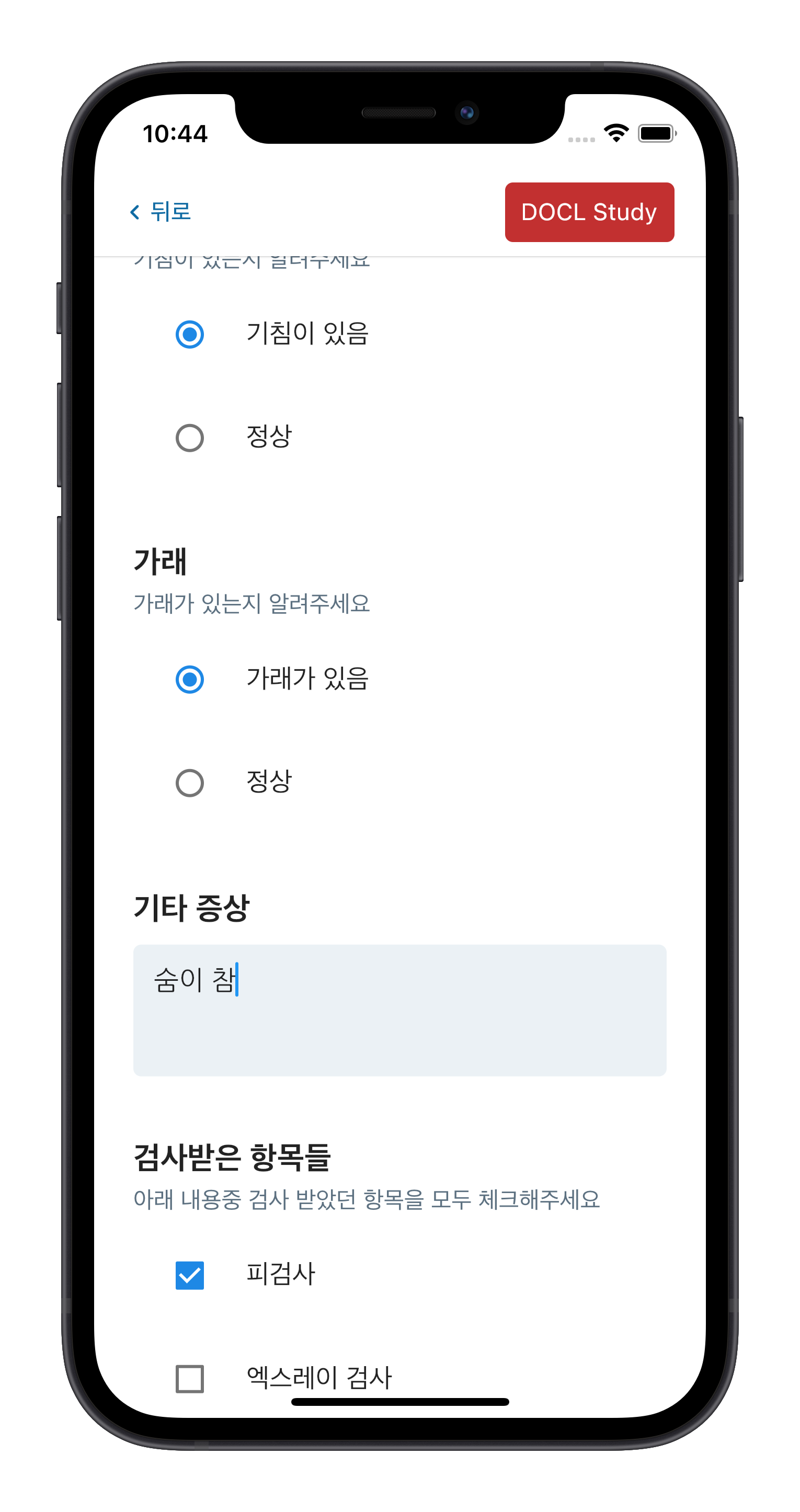 환자용 설문 앱을 통해 환자에게 진료 전 설문 / 관리 기록지를 입력받을 수 있습니다.